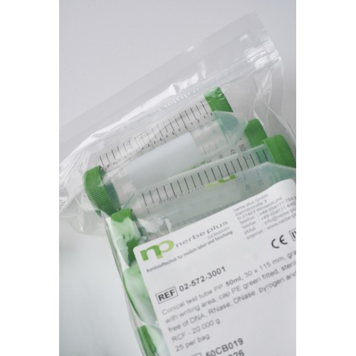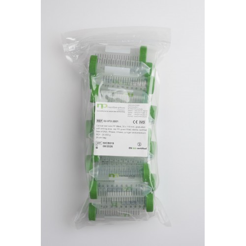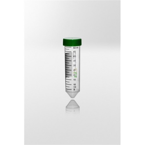 Etichete: Tuburi Centrifuga sterile PP cu capac verde PE, 50ml, Ø30x115 mm, fund conic, gradate, cu suprafata de scriere, pcr ready, RCF max 20000g, 250/pk